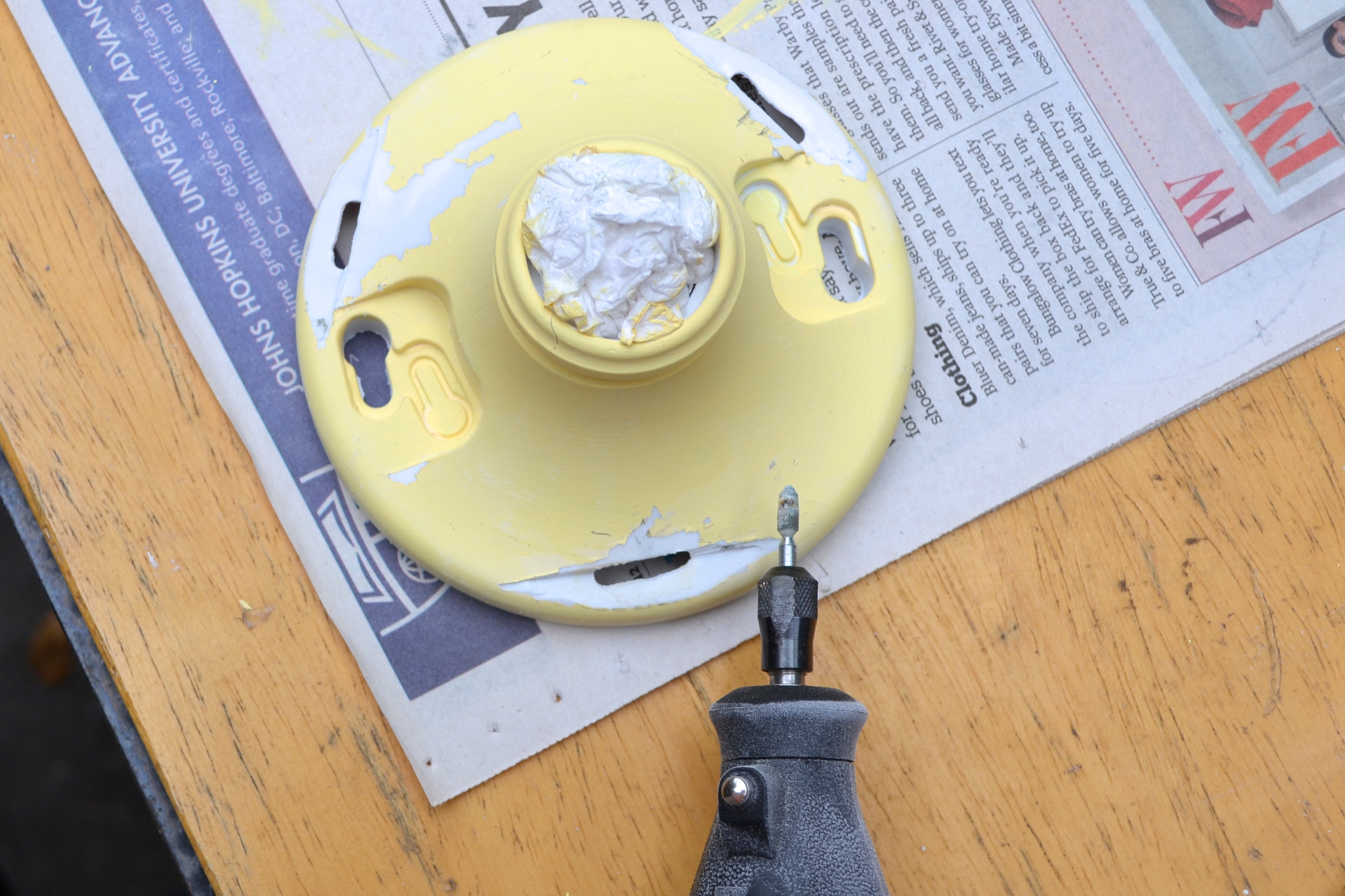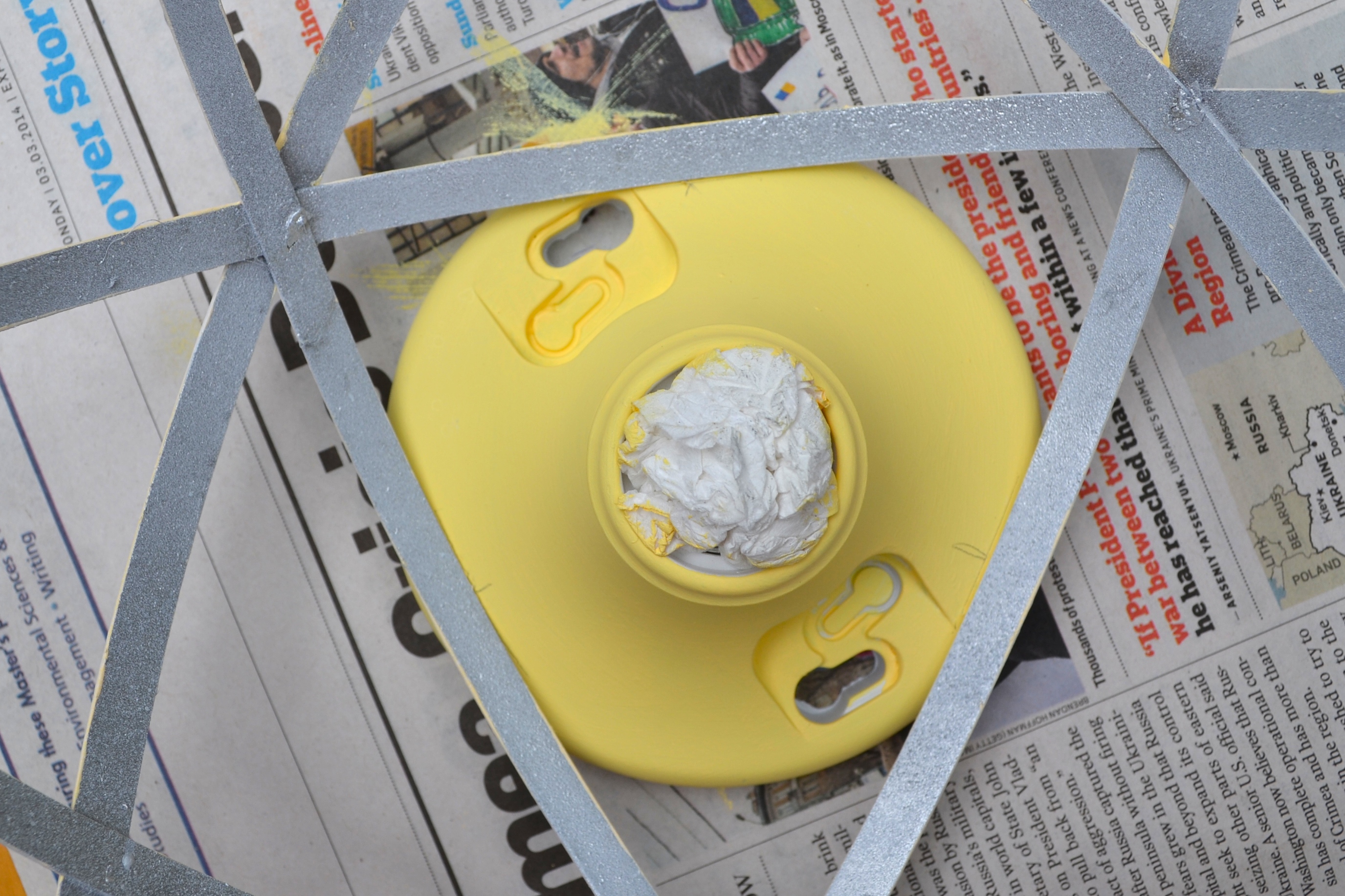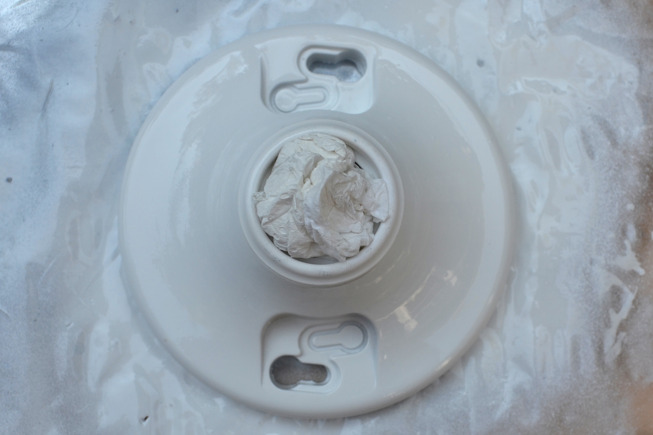 First, I removed the inner plastic ring, took the glass shade off and put both aside. I completely tape off the socket so that no paint could get in. Then I took off the base. I also took it apart to paint the metal cover and the fitting at the bottom of the stem, but in hindsight I think taping off the plastic bottom would be just fine. If you do take it apart, be careful to remember the order of the pieces. I didn’t and it was hard to get back together. These are the pieces to paint copper – I took the pictures from IKEA.